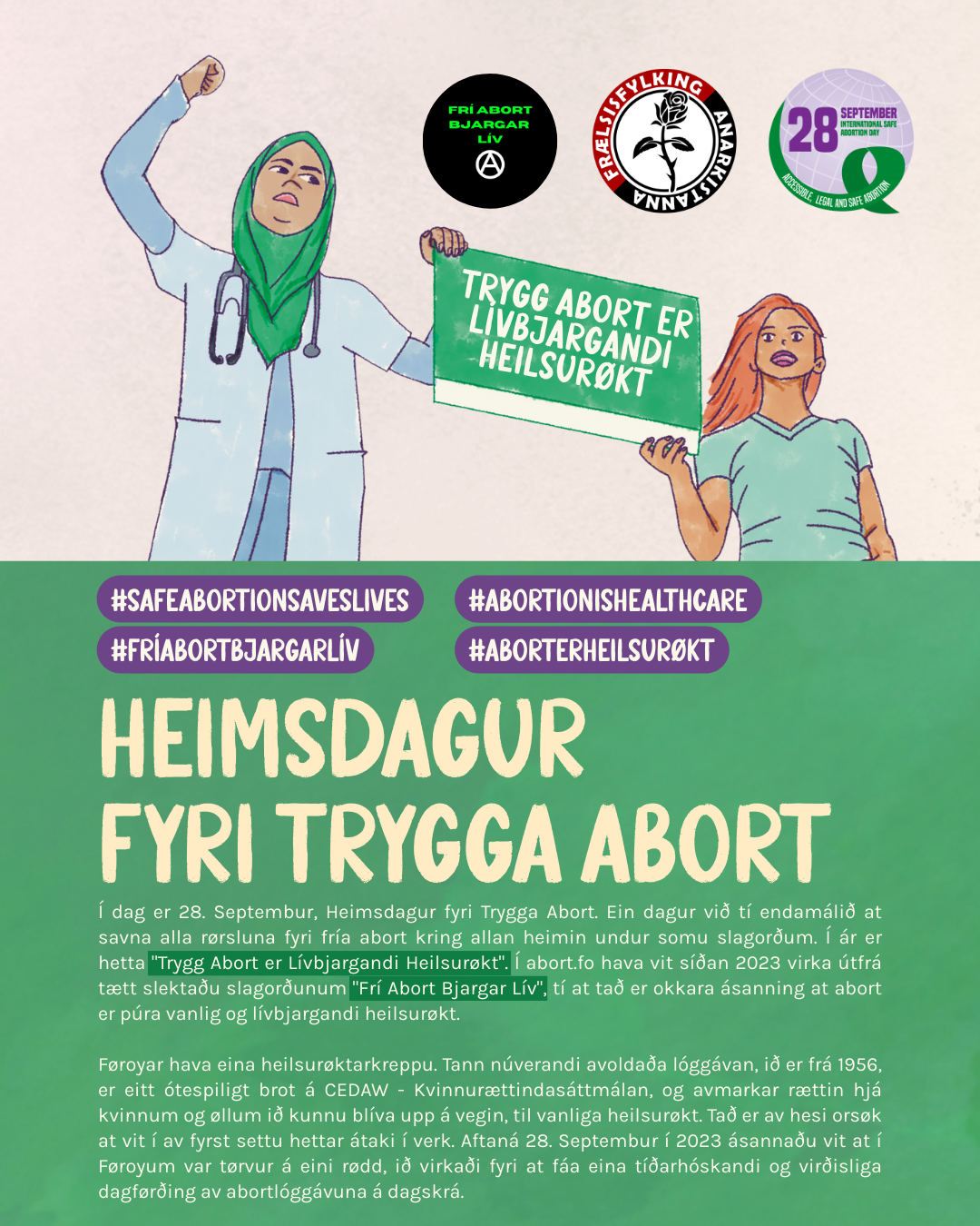 Í dag er 28. Septembur, Heimsdagur fyri Trygga Abort. Ein dagur við tí endamálið at savna alla rørsluna fyri fría abort kring allan heimin undur somu slagorðum. Í ár er hetta “Trygg Abort er Lívbjargandi Heilsurøkt”. Í abort.fo hava vit síðan 2023 virka útfrá tætt slektaðu slagorðunum “Frí Abort Bjargar Lív”, tí at tað er okkara ásanning at abort er púra vanlig og lívbjargandi heilsurøkt.